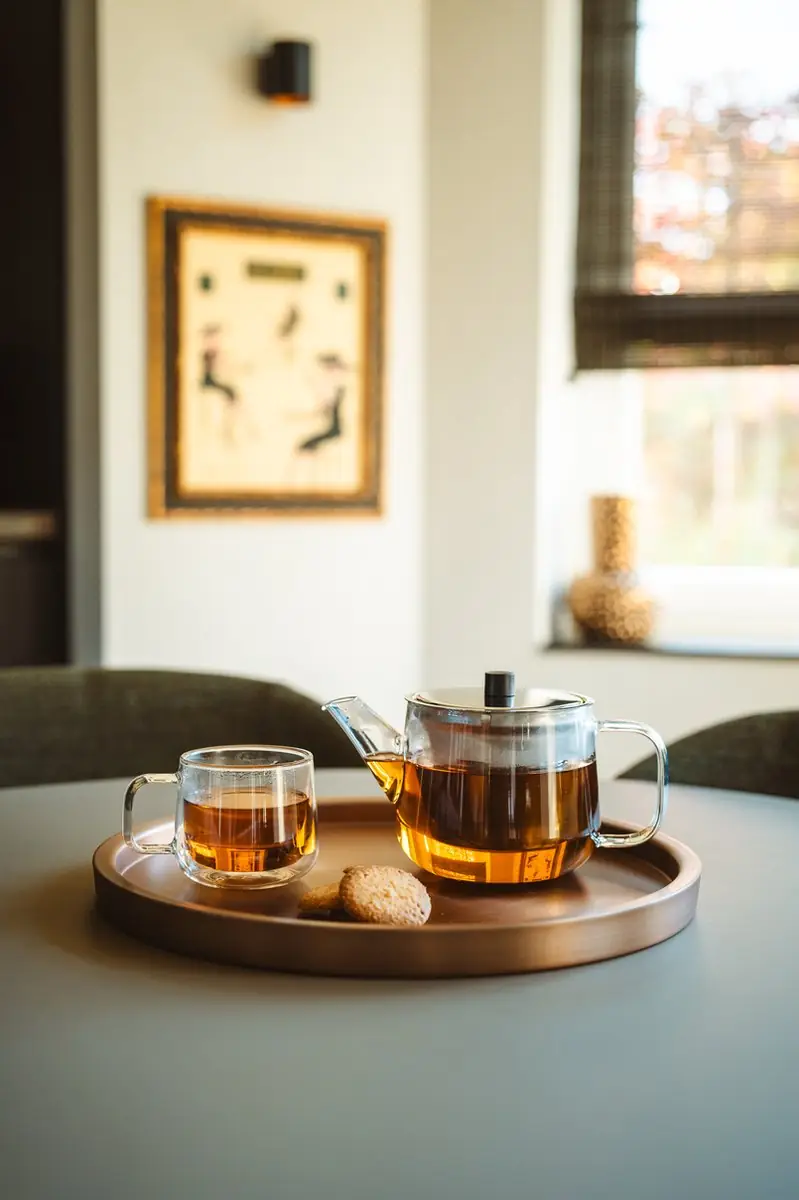 De luxueuze metallic bronzen afwerking straalt warmte en karakter uit, waardoor het dienblad niet alleen praktisch is, maar ook dienst doet als decoratief element.