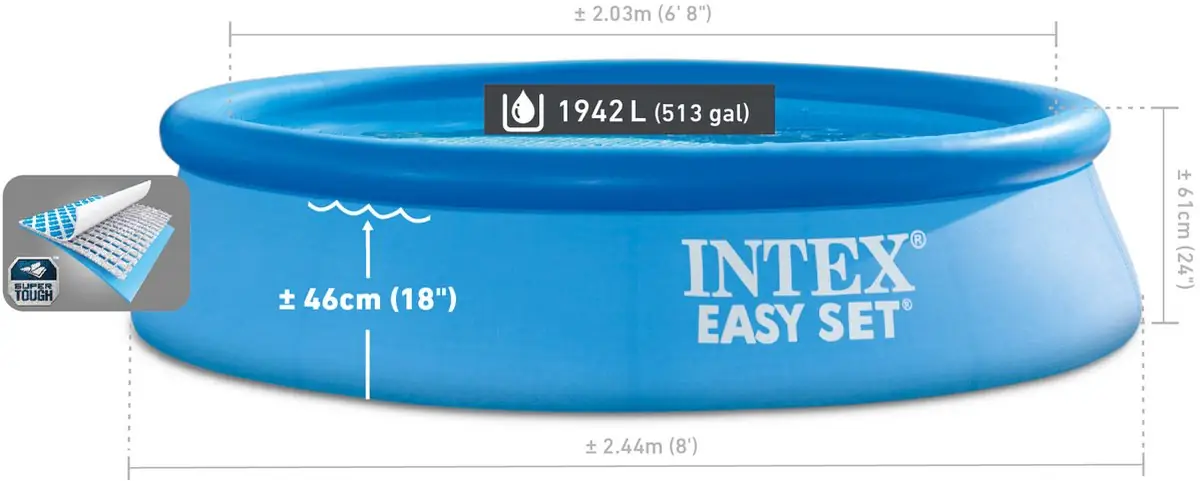 Zorg voor urenlang zomerplezier in je eigen tuin met dit Intex Easy Set opblaaszwembad! Met een diameter van 244 cm en een hoogte van 61 cm biedt dit zwembad ruimte voor het hele gezin. Dankzij de meegeleverde filterpomp van 2271 liter per uur blijft het water fris en schoon. Binnen 10 minuten opgezet en klaar om te vullen!