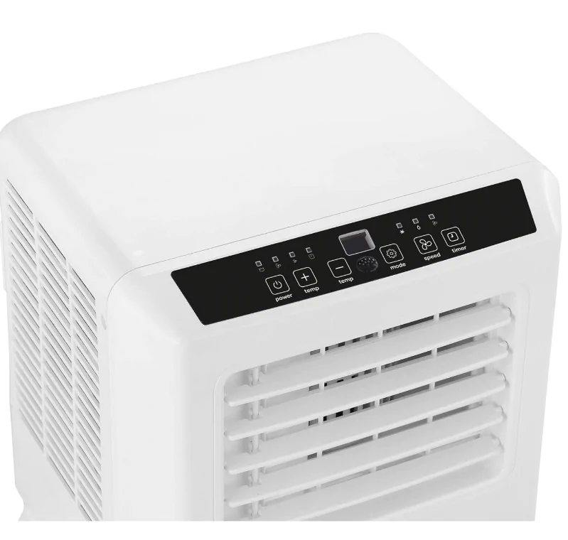 Aan de bovenkant van de mobiele airco zit het bedieningspaneel waar je het apparaat kunt instellen. Maar dat kan ook met de meegeleverde afstandsbediening. Heel handig als je in bed of op de bank ligt.