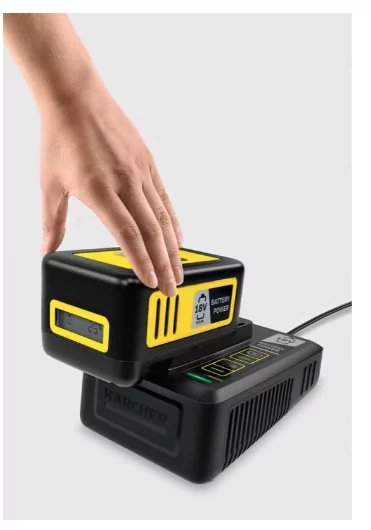 18 V / 5,0 Ah Kärcher Battery Power-verwisselbare accu met innovatieve Real Time Technology kan in slechts 94 minuten tot 80 procent worden opgeladen met de 18 V-snellader. De starterkit Kärcher Battery Power 18/50 kan worden gebruikt voor alle apparaten van het 18 V Kärcher-accuplatform.
