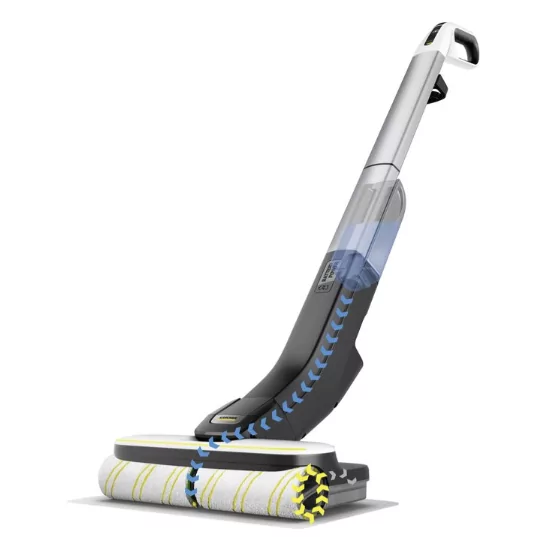 Met de harde vloerreiniger FC 4-4 bespaar je jezelf het stofzuigen voordat je gaat dweilen en verwijder je in één handeling droog en vochtig alledaags vuil. Met de lange accuduur van maximaal 30 minuten per acculading kunnen ruimtes tot 90 vierkante meter moeiteloos worden schoongemaakt. Met de meegeleverde snellader Duo is opladen in slechts 70 minuten mogelijk. Via een visueel signaal wordt gecommuniceerd wanneer de schoonwatertank moet worden bijgevuld en de vuilwatertank moet worden geleegd. Na het activeren van het apparaat worden de twee rollen automatisch bevochtigd met het water uit de verswatertank. Met de 2 reinigingsstanden kan de hoeveelheid water worden aangepast aan de vloerbedekking. De FC 4-4 reinigt ook moeilijk bereikbare plekken en pakt haartjes met gemak op. Direct contact met vuil wordt vermeden dankzij de geïntegreerde en hygiënische vuilwatertank, die na gebruik van het apparaat verwijderd en gereinigd kan worden. De FC 4-4 staat op zichzelf en kan dankzij de afneembare handgreep ruimtebesparend worden opgeborgen. Het apparaat is geschikt voor alle harde vloeren. De verwisselbare 4 V Kärcher Battery Power accu's zijn te gebruiken met alle 4 V Kärcher Battery Power-apparaten.