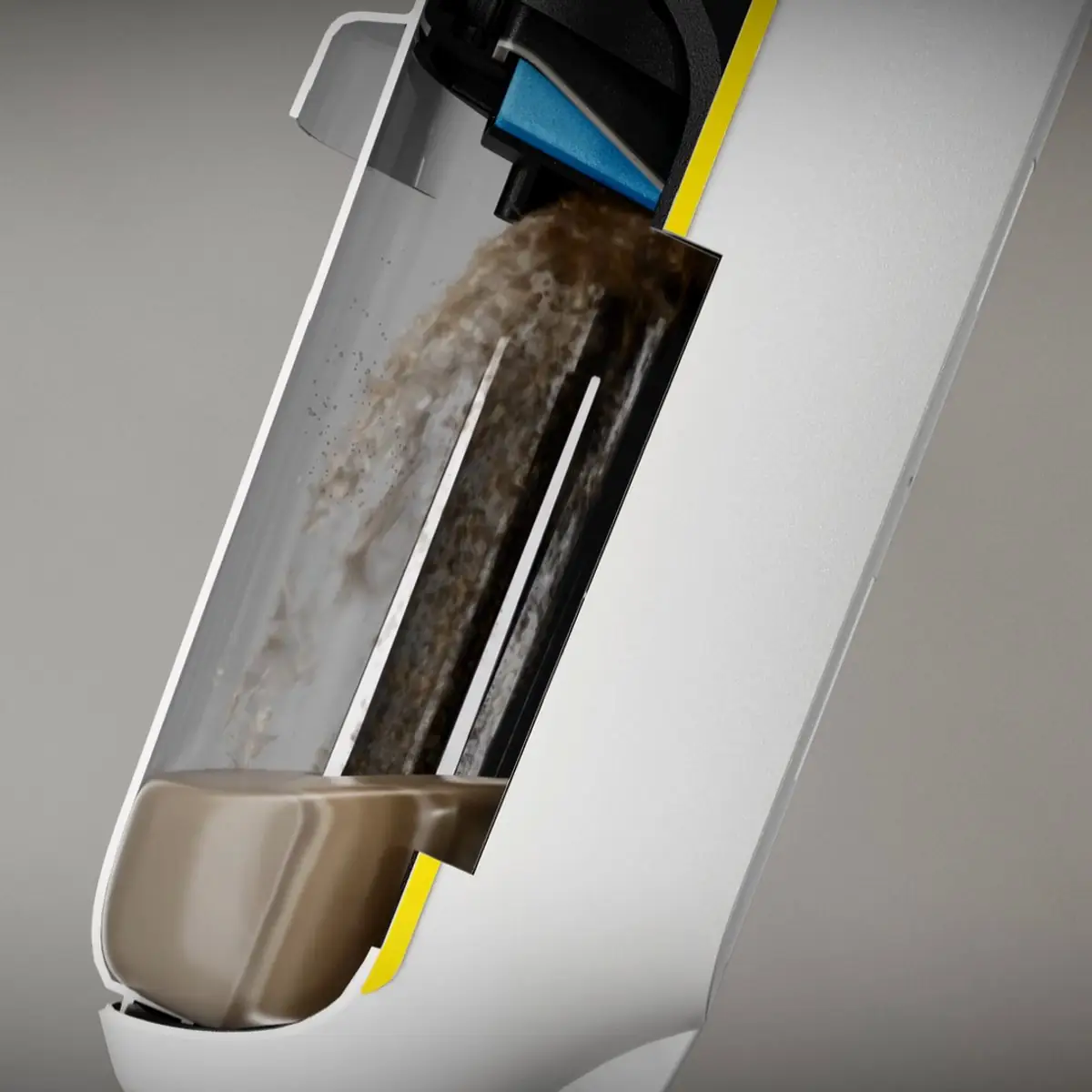 De schoonwatertank van 750 ml zorgt voor constant fris water op de rollers, terwijl het vuile water direct in de vuilwatertank van 450 ml wordt opgevangen. Geen kruisbesmetting, wel een zichtbaar schoon resultaat.