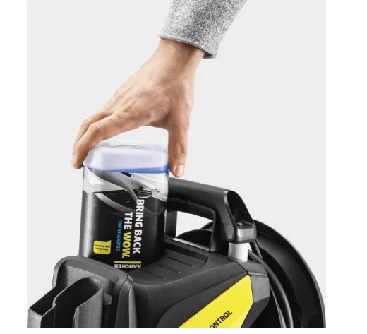 Het apparaat heeft ook een boost-modus voor extra vermogen, G 180 Q Smart Control-spuitpistool met LCD-display en de 3-in-1 Multi Jet-spuitlans. De druk wordt direct op het spuitpistool ingesteld of met behulp van de toepassingshulp vanuit de app naar het spuitpistool overgebracht. Op het LCD-display kun je zien welk drukniveau is ingesteld, of de boost modus kan worden geactiveerd of dat het apparaat nog in de inactieve modus staat. Andere uitrustingsdetails zijn onder meer de ingebouwde slanghaspel voor comfortabel gebruik, het Plug ’n’ Clean-reinigingsmiddelsysteem, de hoogwaardige aluminium telescopische handgreep en de parkeerpositie voor gemakkelijk toegankelijke accessoires.