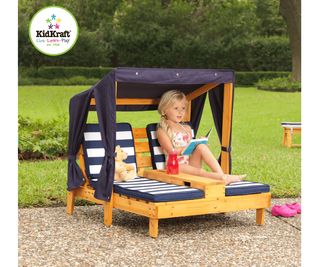 Uw kleintjes kunnen buiten spelen en ontspannen met de tweepersoons chaise longue van KidKraft. Als het buiten warm wordt, zijn kinderen beschermd tegen de zon en kunnen ze "chillen" onder de 3-zijde parasol. Deze lounge is gemaakt van hoogwaardig, weersbestendig hout - het blijft er jaar na jaar goed uitzien, zelfs in de regen, zon en sneeuw. Wat is er nou beter op een warme, zonnige dag? En koudglas limonade, of twee, past perfecgt in de bekerhouders!