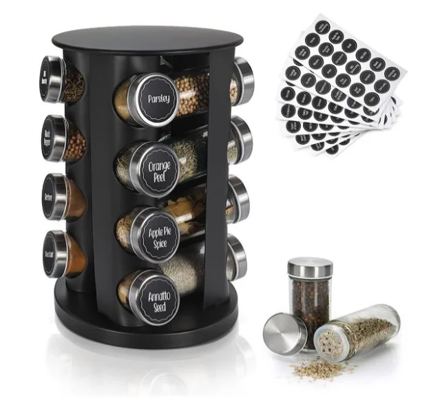 Dit staande kruidenrek is ontworpen om geen ruimte te verspillen. Daarom bestaat het uit 4 rijen van 4 potjes. Met een hoogte van 34cm zet je de carrousel makkelijk in een keukenkastje. Of juist mooi op het aanrecht. En met 16 glazen potjes kan zelfs de fanatiekste kookliefhebber al zijn kruiden kwijt.