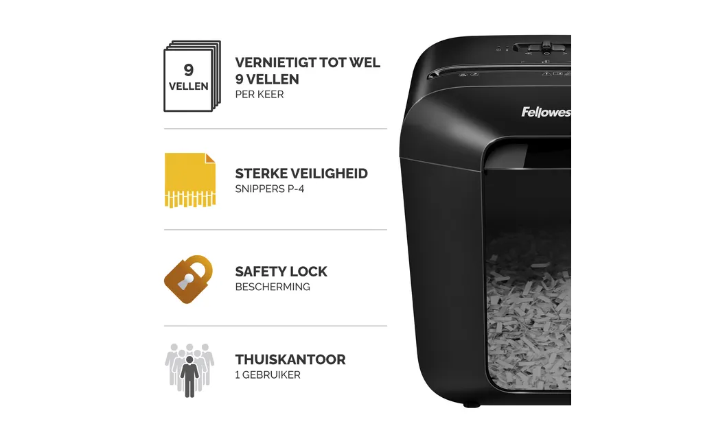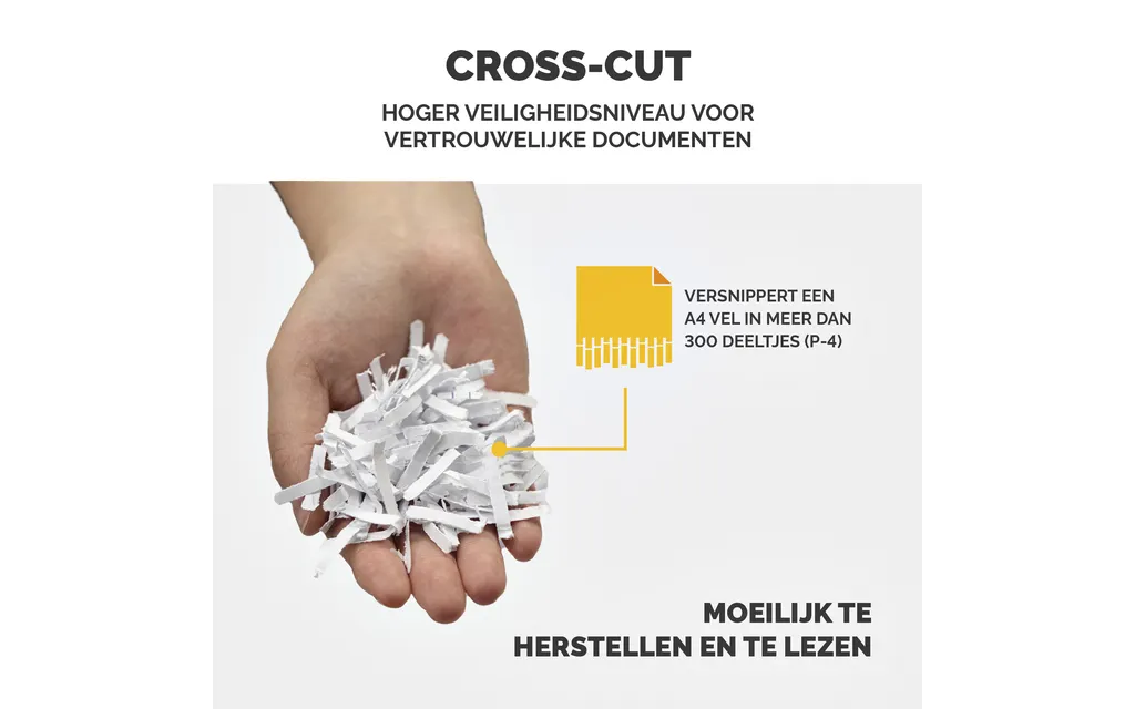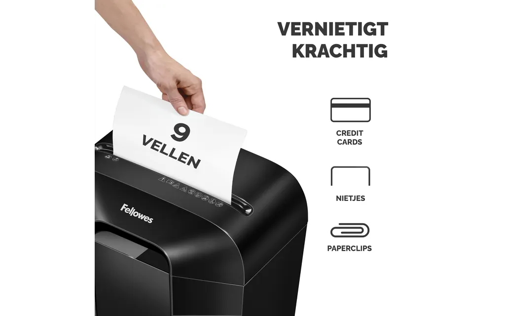 Je vernietigt moeiteloos tot 9 A4-vellen per keer, inclusief kleine metalen onderdelen. Met de 15 liter opvangbak kun je langere tijd doorgaan zonder te legen.
