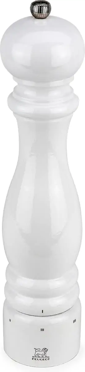 Deze Peugeot pepermolen ‘Paris’, gemaakt van glazend gelakt beukenhout, is het klassieke, meest bekende model van Peugeot. De pepermolen is voorzien van het unieke u-select systeem, waarmee de grofheid van de maling traploos en nauwkeurig wordt ingesteld door de ring aan de voet van de molen te draaien. De molen is uiteraard voorzien van het unieke Peugeot maalwerk. Peugeot heeft voor iedere specerij een eigen maalwerk, dat het beste uit de specerij haalt. Het Peugeot maalwerk is gemaakt uit gehard en gesmeed staal. Op het functioneren van het maalwerk geldt maar liefst levenslange garantie. De molen wordt compleet geleverd met peperkorrels.