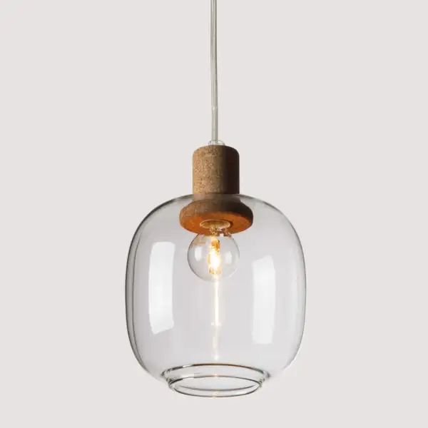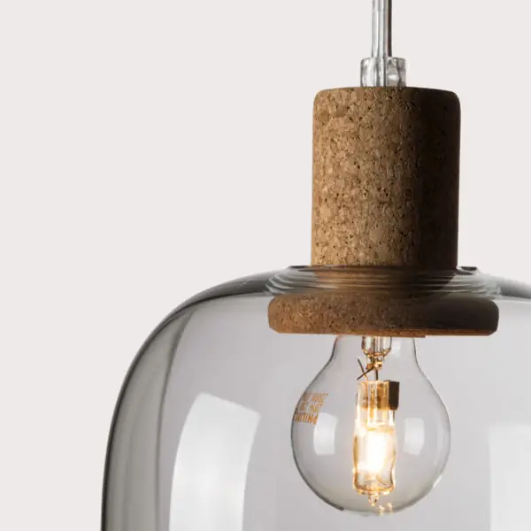 De eenvoud van het ontwerp, gecombineerd met klassieke materialen zoals glas en het verrassende gebruik van kurk, zorgt voor een prachtig contrast. De zorgvuldig gekozen kleuren van het glas geven de lamp een eigentijdse uitstraling.