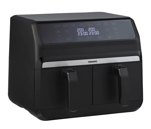 Met de Tomado TAF8001B dubbele airfryer heb je binnen no-time de lekkerste gerechten op tafel. Met een inhoud van 8 liter is hij perfect geschikt voor het bereiden van frites, snacks, vis, vlees en groenten. De airfryer bakt door middel van hetelucht waardoor er geen vet of olie wordt toegevoegd aan de etenswaren. Wel zo gezond! Naast het frituren zonder olie kan je met deze airfryer ook grillen, roosteren, braden, bakken en opwarmen. De twee aparte manden hebben een inhoud van 4 liter per stuk. Hiermee kan je 800 gram frites per mand bakken. Je stelt gemakkelijk de timer, temperatuur en het juiste programma in via de verlichte tiptoetsbediening. Dankzij de Dual-Dish functie bereid je 2 verschillende gerechten én zijn ze tegelijk klaar. Zodra jouw etenwaren klaar zijn kan je met een gerust hart de airfryer aanraken zonder je handen te branden, dankzij de koele behuizing.