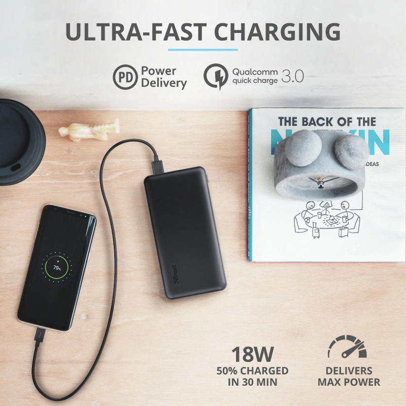 Met dank aan slimme technologie is de Trust Primo Ultra-Fast Powerbank de razendsnelle oplossing voor een lege batterij. De Powerbank laadt je apparaat met de hoogst mogelijke snelheid op, waardoor je smartphonebatterij na een halfuur tot wel 50% is opgeladen. Met een extra hoge capaciteit en de mogelijkheid om drie apparaten tegelijk aan te sluiten, zal de powerbank er keer op keer voor je zijn.