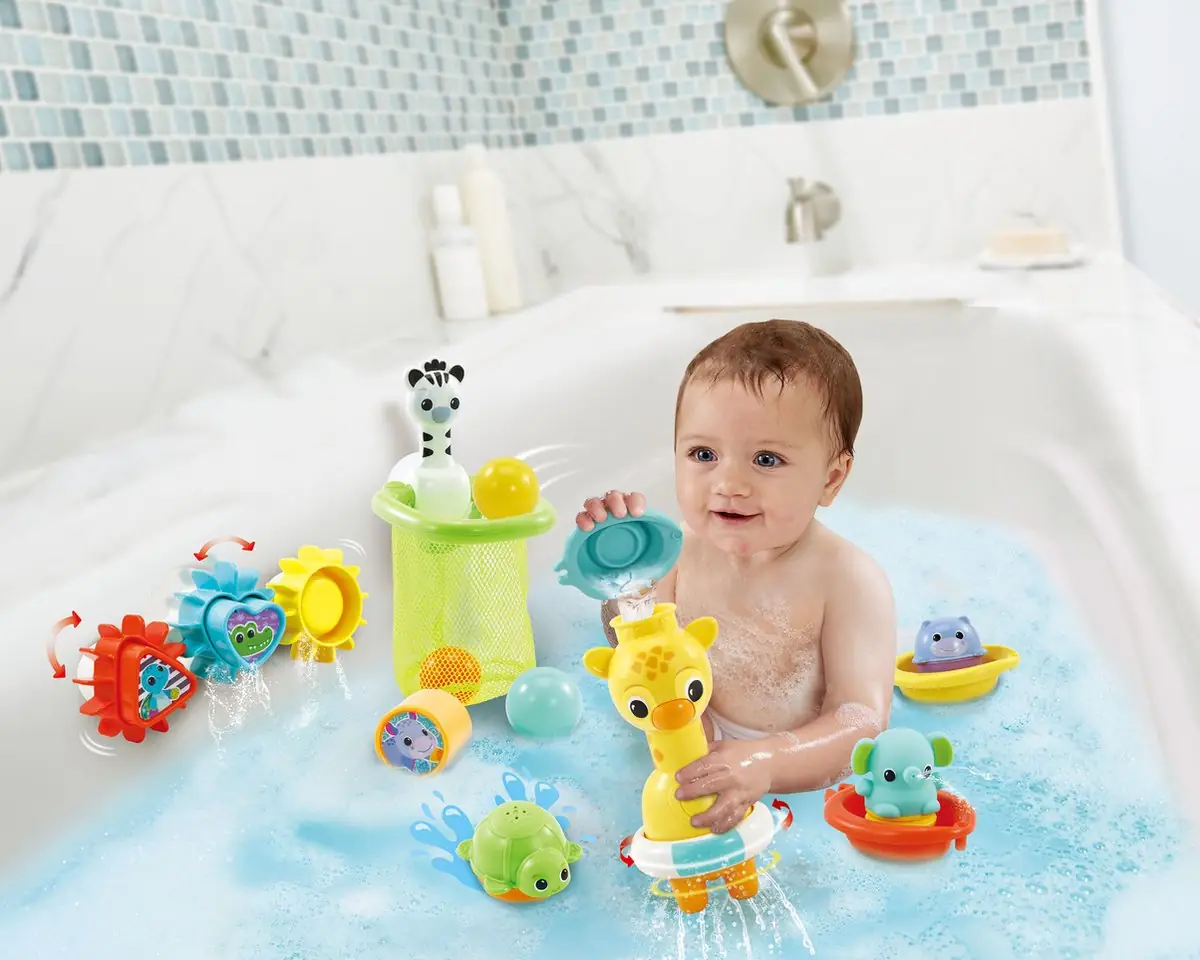 Spetter-de-spet wat een waterpret! 15 onderdelen voor eindeloos speelplezier in bad. Giet water in de giraffe en zie hoe hij ronddraait in het water. Stapel de bootjes of haak ze aan elkaar vast om een boottreintje te maken. Knijp in het olifantje om water door zijn slurf te spuiten en schep of giet water met de dieren-bakjes. Plaats de vormpjes in het juiste tandwiel en schep de ballen uit het water met het net voor nog meer speelplezier!