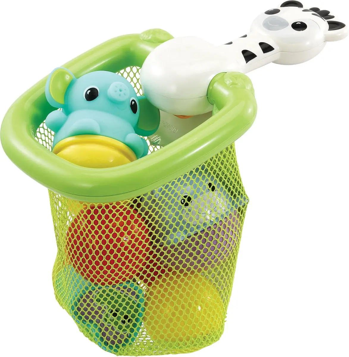- Gebruik het netje om de ballen en diertjes uit het water te scheppen en gebruik de zuignap om het netje te bevestigen aan een bad of badkamerwand om alles op te bergen en te laten drogen
