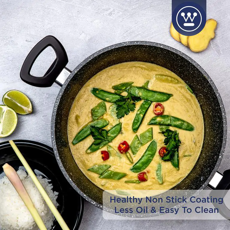 De Westinghouse kookpan/braadpan heeft een duurzame anti-aanbaklaag met een Black Marble finish coating. De dikke alumunium bodem zorgt voor een snelle opwarming en gelijkmatige warmteverdeling.